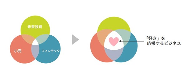 丸井グループでは「好き」という感情に注目し、機能や価格ではなく、一人ひとりの想いや価値観が原動力となって動く新しい経済の領域である「『好き』が駆動する経済」という新しい経済圏の開拓をめざしています。今後は、丸井グループのアセットを活かした「フィンテック・小売・未来投資」の三位一体の独自のビジネスモデルの中心に「好き」を応援するビジネスを置き、集中的に投資していく方針です。