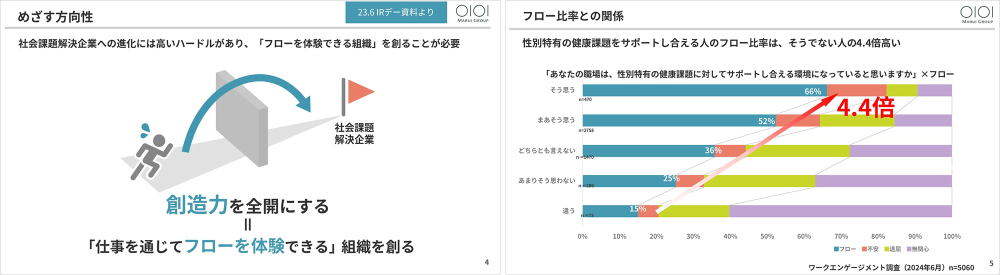 丸井グループでは、社会課題解決企業*1の実現に向け、社員一人ひとりが創造力を全開にするフロー*2を体験できる組織をつくることが必要であると考えています。2024年6月に実施した社内アンケートから、フローを体験できる組織づくりには、性別特有の健康課題をサポートし合えることが1つのカギであることが見えてきました。