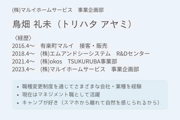 それと、当時の私は「正直、自分に向いている仕事なんてわからない!」と思っていたんですが、丸井グループには会社・部署をまたいで職種変更できる仕組みがあって、入社後にいろいろ挑戦できる環境があるのも魅力的でした。その結果、入社前には想像もしていなかったほど、さまざまな経験ができ、本当に良かったと今は感じています。