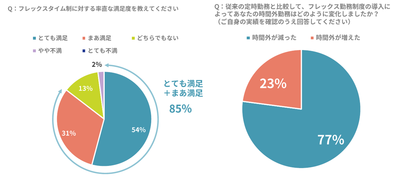 実際にフレックス勤務を導入している部署の約80%が「残業時間を削減することができたと」回答していますので、特にフレックスタイム勤務は残業削減に有効だと考えています。