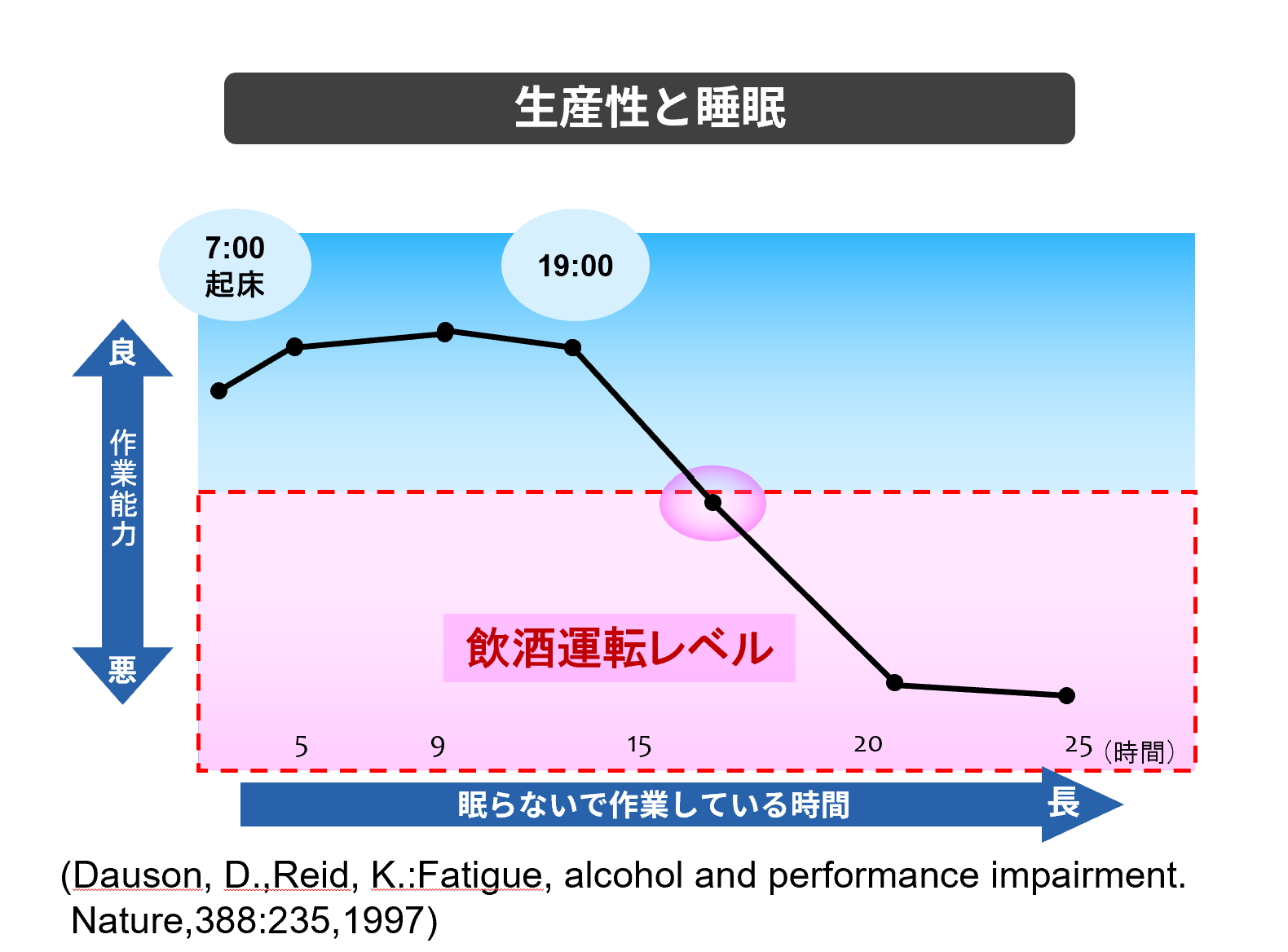 1日の労働時間が13時間を超えるとどんどんパフォーマンスが落ち、15時間を超えると飲酒運転レベルの注意力になるという研究結果も出ています。
