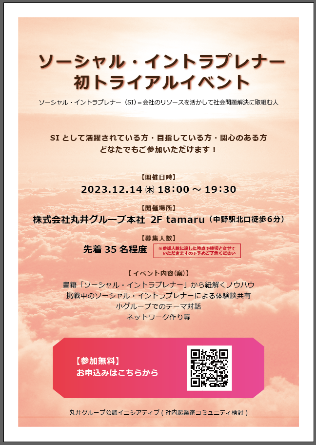 今後は、「ソーシャル・イントラプレナーが集うコミュニティ形成」をめざし、すでにソーシャル・イントラプレナーとして活躍されている方だけでなく、興味はあるけど何から始めればいいかわからないという方まで多くの方を巻き込みながら、社会の大きな渦となるように活動を行っていきます。