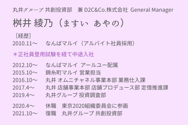 丸井グループでは「お客さまのお役に立つために進化し続ける」「人の成長=企業の成長」を経営理念に掲げ、人的資本経営に取り組んでいます。手挙げ制による自主的な学びの場への参加やグループ間職種変更など、多くの社員がさまざまな経験をそれぞれのキャリアに役立てて活躍しています。 連載「カラフルキャリア~私の原動力~」では、多様なキャリアで活躍する社員に注目し、その原動力をひも解いていきます。今回は、「女性の活躍」をテーマに、多彩な経験を現業で活かしている共創投資部の桝井綾乃さんにお話を聞いてきました。