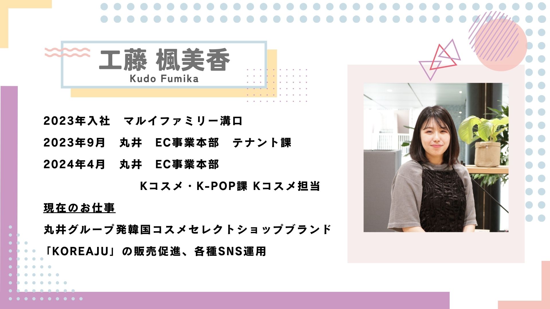 私は、大学時代に旧渋谷マルイで出会った韓国コスメのイベントが転機でした。ブランドの世界観を感じながら、商品を一気に試せる体験がとても新鮮で、「こんなワクワクする空間を自分でもつくってみたい」と思うようになりました。その後、丸井グループに入社し、新入社員研修の一環で、韓国コスメのイベントに1週間限定で接客応援として入らせてもらったんですが、実際にお客さまと接して「この場所でコスメの魅力をもっと伝えたい」と強く感じ、お願いして応援期間を延長してもらいました(笑)。その後も、イベントへの接客応援や、マルイの通販サイトのUI改善など、積極的にさまざまな業務に手を挙げてかかわる中で、「コスメが好き」という気持ちを伝え続けてきたことで、現在のKコスメ担当に配属されました。