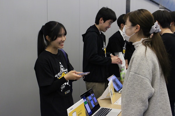 プレゼンテーション後には、ファイナリストから直接アプリの説明を聞ける「アプリ体験会」が開かれました。プレゼンを終えて少し肩の力が抜けた様子の皆さんと、会場の熱気を感じながら熱心に質問する参加者との間で、活発な交流が生まれていました!