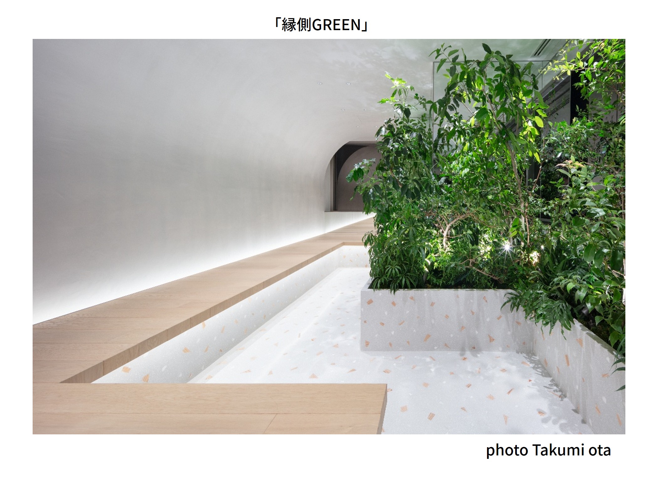 また、あまり活用されていなかった休憩スペースは、社員がリラックスできる「縁側GREEN」へとリニューアルしました。縁側をイメージしたベンチの足元には、庭の砂利をほうふつとさせる石と廃材の木を配合したテラゾー材を使用。さらに窓面を全面植栽とし、グリーンに包まれた空間としています。対面ではなく横並びに座ることで、緩やかなコミュニケーションが生まれることを狙いました。