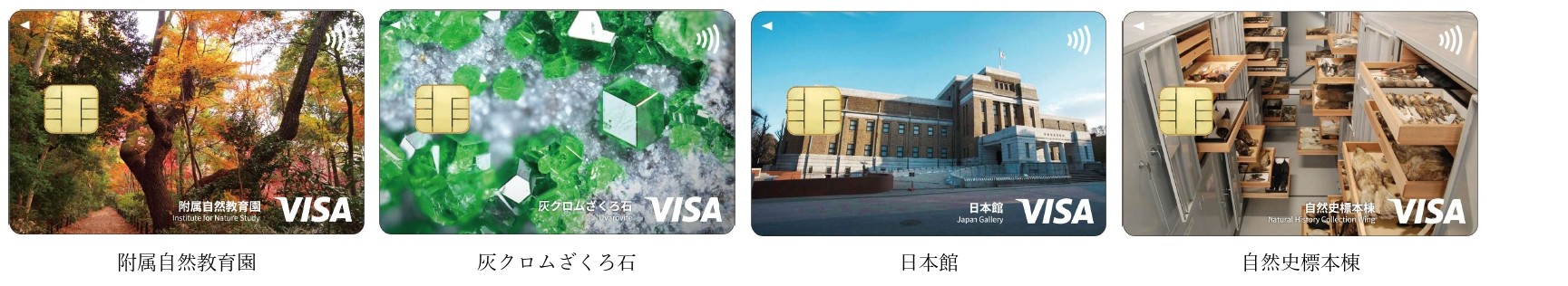 今回の券面には、鮮やかな緑色が特徴的な鉱物である「灰クロムざくろ石」を用いたデザインや、銀色に輝く斑紋(はんもん)の美しさで知られる名碗「油滴天目」、多種多様な標本が数多く収蔵されている「自然史標本棟」など、幅広いデザインをご用意しています。