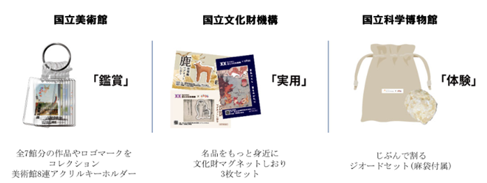 入会後3カ月以内に税込30,000円以上ご利用いただいたお客さまには、選んだ券面デザインごとの「ミュージアム」をイメージした特典をプレゼントいたします。例えば美術館では「鑑賞」を楽しみに来館される方が多いことから、国立美術館7館それぞれが選んだビジュアルを起用したアクリルキーホルダーにするなど、3法人それぞれファンの皆さまの志向に応える特典となっています。