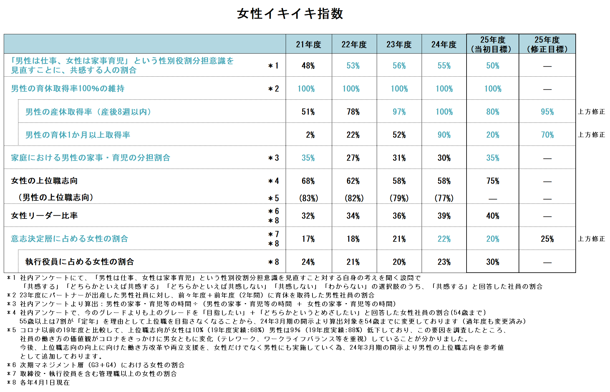 この課題を踏まえ、2021年度からは女性活躍を妨げる要因を「男女の性別役割分担意識」と捉え、男性の「産休取得率」や「育休1カ月以上取得率」などを盛り込んだ新たな「女性イキイキ指数」を設定。2025年度までの目標を掲げ、進捗の可視化を進めています。