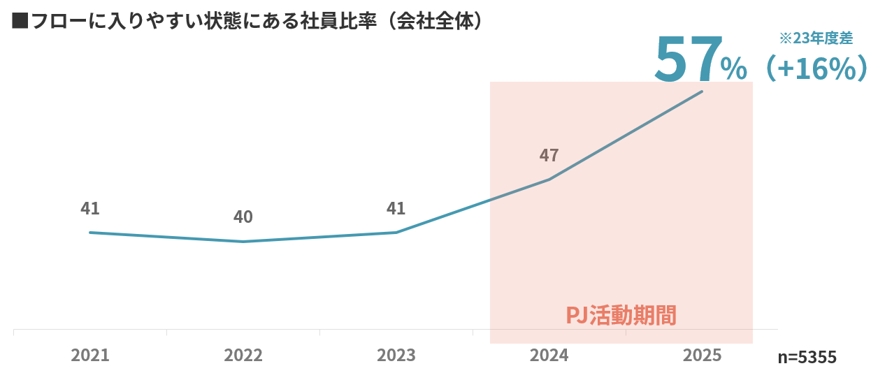 各職場において仮説検証をくり返したことで、創造力を全開にし、新たな物事に挑戦するマインドの高い職場づくりを成功させる鍵は「いかにフローに入る要素を本業へ組み込めるか」であることが判明。プロジェクトメンバーが中心となり、各職場で自分自身の業務と会社のめざす姿のつながりを理解する取り組みや、個人の成長実感につながる業務習得体制の見直しなどに取り組みました。また、フロー状態に入るための阻害要因となっている課題に向き合い、業務の取捨選択などを継続して行った結果、全社のフロー比率もプロジェクト発足前の41%から57%まで大きく伸長しています。