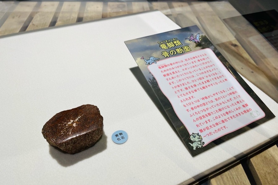 発掘から復元までの流れや、恐竜研究の歴史を学べるゾーンです。カルカロドントサウルスやスピノサウルスなどの化石の一部を、研究者の視点でじっくり観察!クイズ形式で化石の観察ポイントを楽しく学べます。