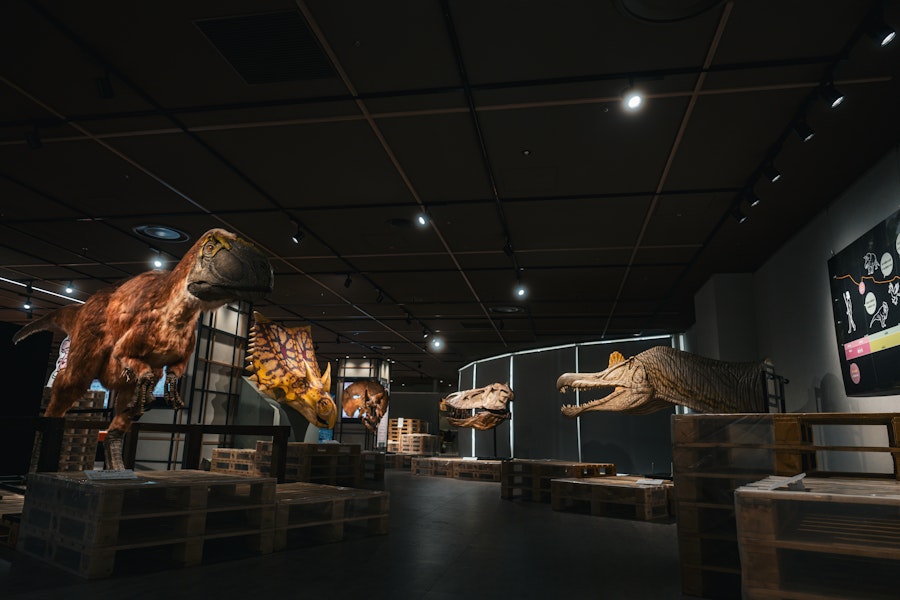 全長約6mのユティランヌスの生体復元モデルや、ティラノサウルス・トリケラトプスの頭部骨格レプリカがお出迎え。進化年表をもとに、恐竜の種類や特徴を楽しく学べるゾーンです。